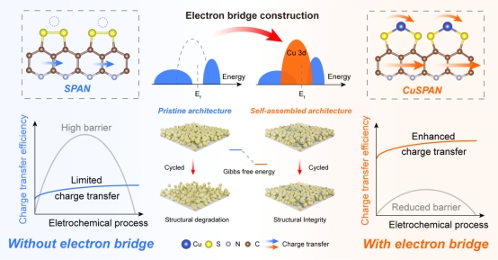 该策略通过引入过渡金属铜,实现了对硫化聚丙烯腈(SPAN)正极电子特性的精准调控。研究发现,铜与SPAN之间形成的动态d-p轨道杂化作用,有效地闭合了能带隙,促使材料电子特性从半导体态向金属态转变,从而建立了高速电子传输通道,极大地加速了氧化还原动力学过程。研究指出,该策略由热力学有利过程驱动,原位自组装生成的CuSPAN材料显著强化了正极的结构稳定性。