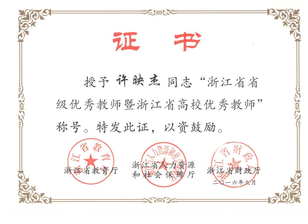 “浙江省高校优秀教师奖”是浙江省教育厅、人力资源和社会保障厅、财政厅为进一步增强广大教师教书育人的责任感和使命感,弘扬爱岗敬业、爱生重教、为人师表、无私奉献的崇高精神,表彰在教书育人、科学研究和社会服务工作中作出突出贡献的高校教师而设立的省级教师荣誉奖。自2012年首届省高校优秀教师评选以来,我校已有五位教师获此殊荣。