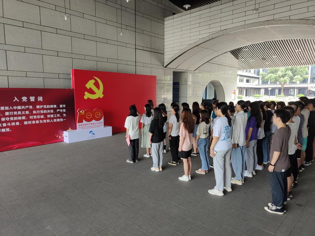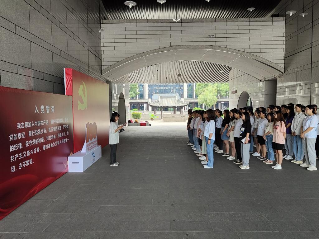 专职组织员俞兰芳老师郑重地为新发展预备党员代表佩戴党徽,祝贺他们成为党组织光荣的一员。随后,由学生第二党支部党员王菲同志领誓,全体学生党员列队肃立,面向鲜红的党旗举起右手庄严宣誓。