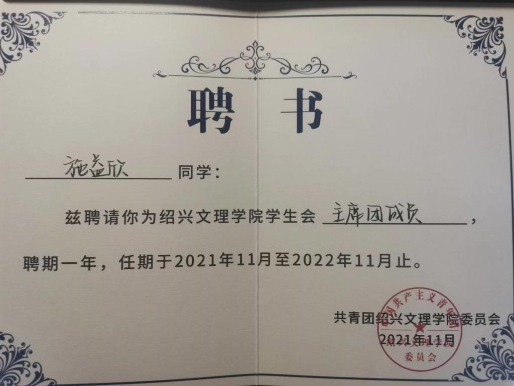 学生会主席团成员,在各项活动中锻炼自我、服务同学。