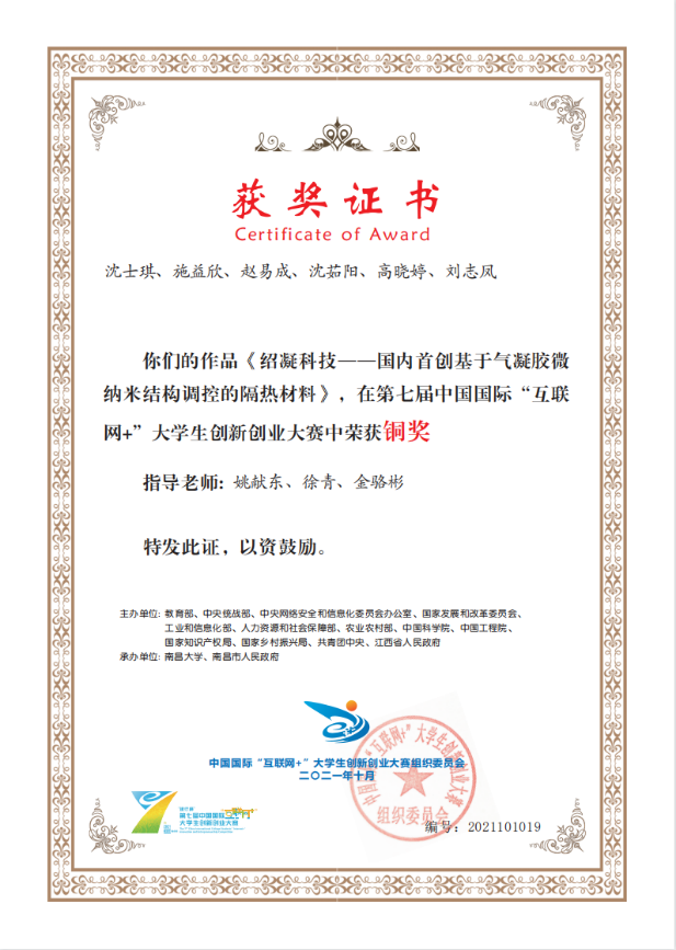 学习过程苦闷而劳累,但也充满乐趣与愉悦。常常经历几个小时、甚至几天的苦战,却毫无成果;熬夜通宵准备比赛,对材料一次又一次修改完善,但他毫不动摇,老师的教诲无时无刻不在激励着他前进。“天将降大任于斯人也,必先苦其心志”,在不懈努力下,他们团队成功破解行业痛点,利用气凝胶微纳结构调控技术使得电池隔热材料的隔热阻燃性能提高3倍,利用新型阻燃涂层技术使得材料的抗震抗剥落性能提升到更高的档次,并且将常压干燥技术应用到气凝胶工业化生产中,使制造成本降低20%。这三大优势使得施益欣团队所研制的气凝胶隔热材料在市场上有着更大的优势。最终,他们团队荣获第七届浙江省国际“互联网+”大学生创新创业大赛金奖、第七届中国国际“互联网+”大学生创新创业大赛铜奖。