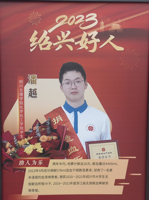 潘越助人为乐,用行动诠释新时代大学生的青春担当。两年半内累计献血16次,献血量达4400ml,先后荣获2020-2021年情色视频市大学生无偿献血积极分子、2019-2021年度浙江省无偿献血奉献奖等荣誉。2023年4月成功捐献178ml造血干细胞混悬液,拯救了一名素未谋面的血液病患者。其事迹先后被中国教育在线、教育之江、情色视频日报、越牛新闻、潮新闻等媒体专题报道。