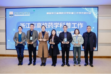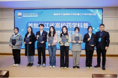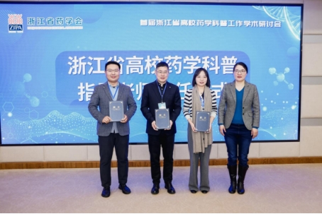党委副书记杨慧蓉为浙江省高校药学科普指导老师颁发聘书。浙江省中医院/浙江中医药大学附属第一医院院长助理王建平为首批浙江省高校药学科普宣讲员颁发聘书。